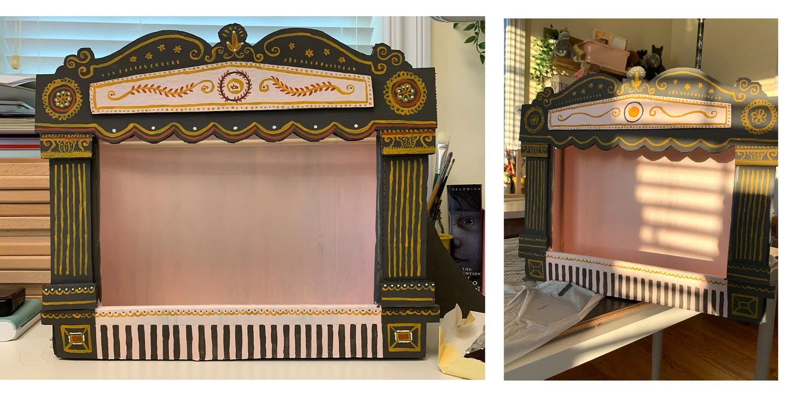 I also made a cardboard box theater from an Amazon shipping box, and painted it like a stage theater. I cut a slit at top to insert characters taped to long champagne straws, and there is also two holes on the left and right to slip a wood dowel for the backdrops. Maybe someday I’ll make a video showing you my process so you can make one - they aren’t difficult, but take some time to paint.