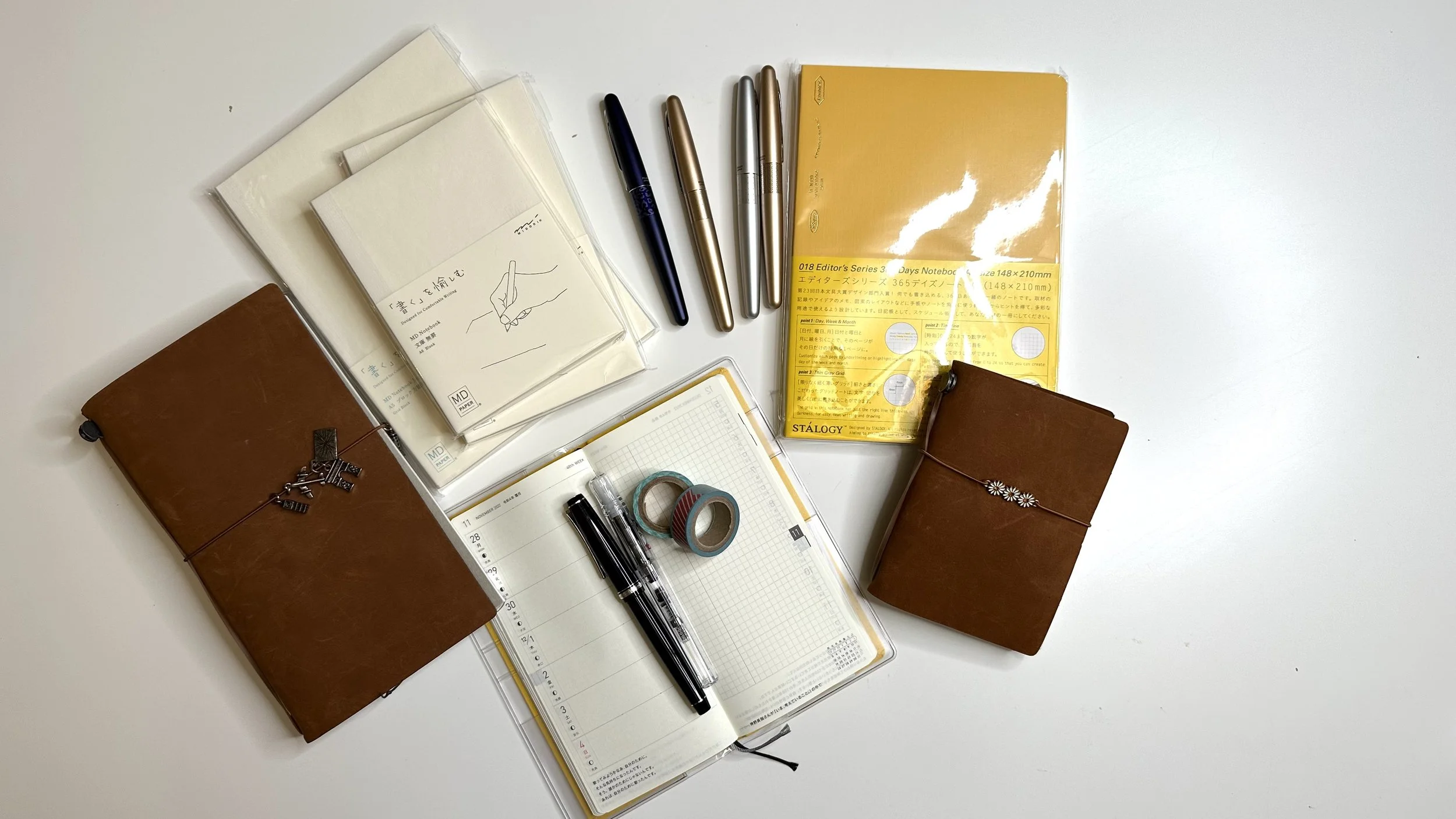 Traveler’s Factory Journals, Midori Notebooks, Stalogy Journal, Pilot Metropolitan, Falcon, and Kakuno Fountain Pens, Washi Tape, Hobonichi Planner