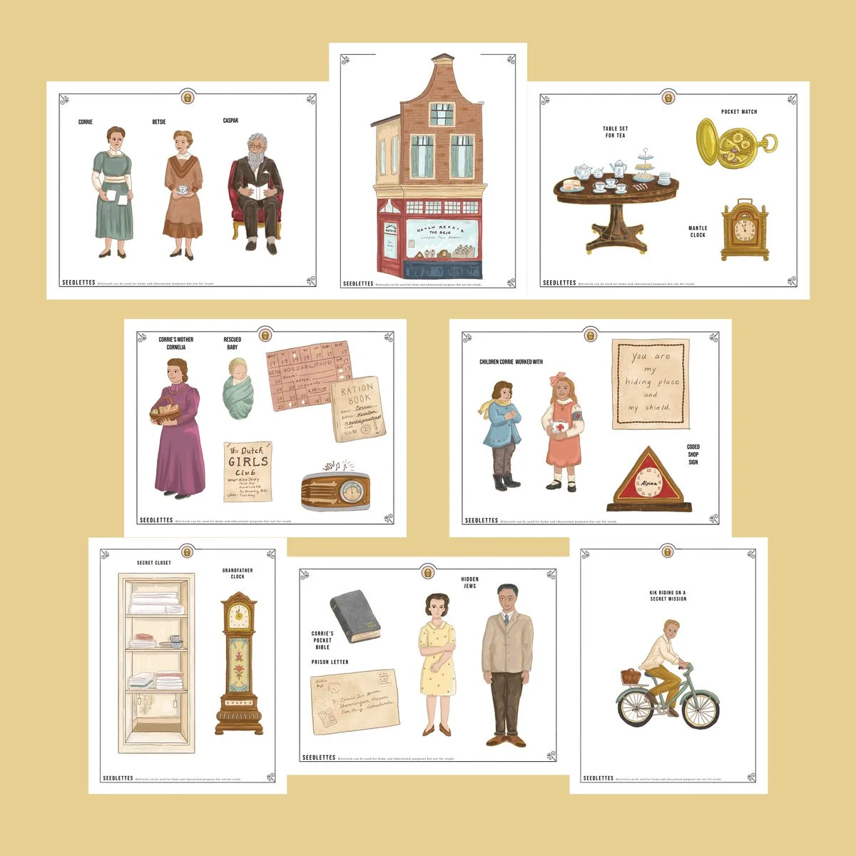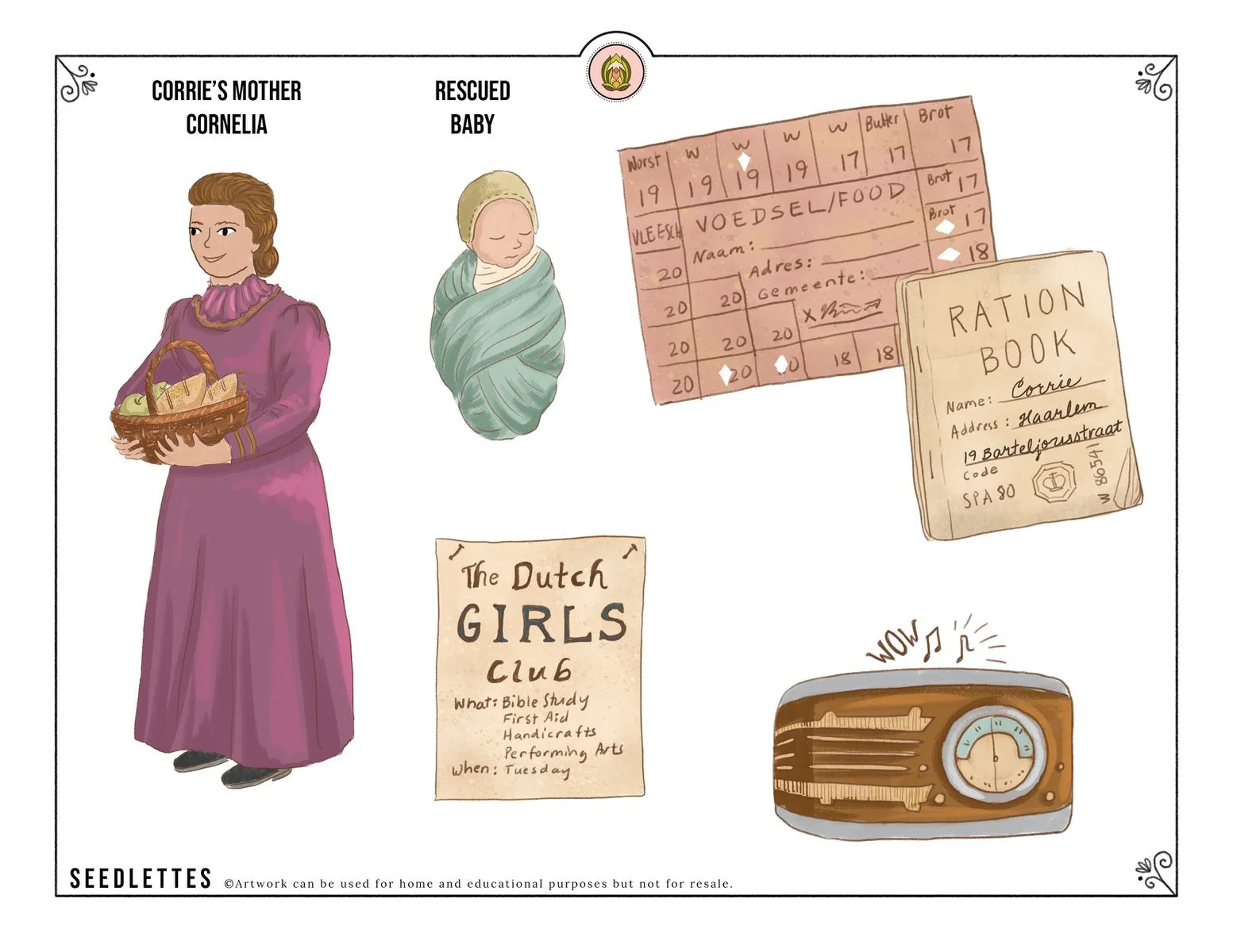 Example of printables of Corrie Ten Boom’s mother, ration cards, radio, flyer, and a child they helped find a home for during WWII.
