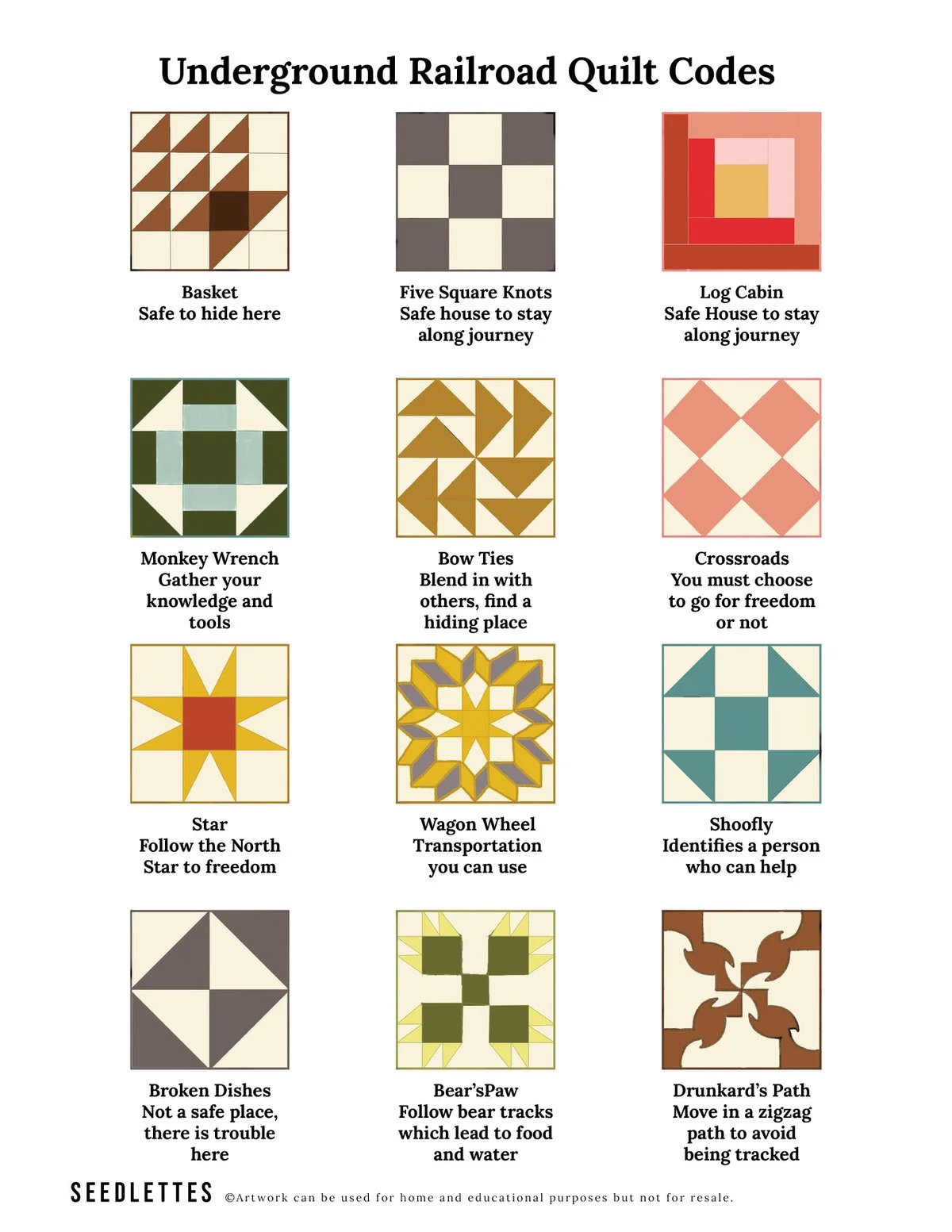 Example of printables of the Underground Railroad Quilt Codes, used by members along the way to direct where to stay and places to avoid.